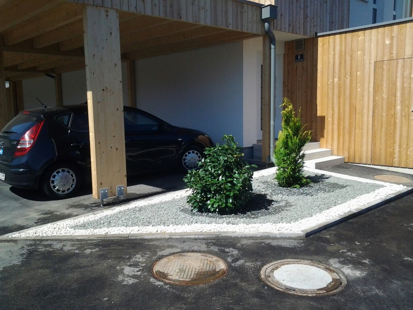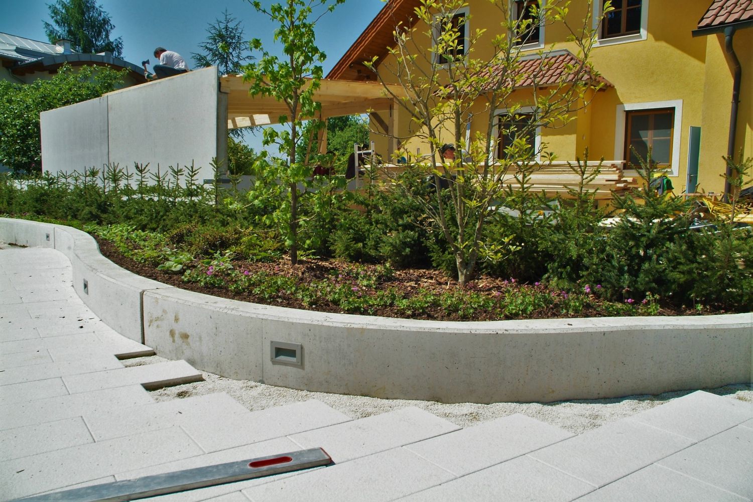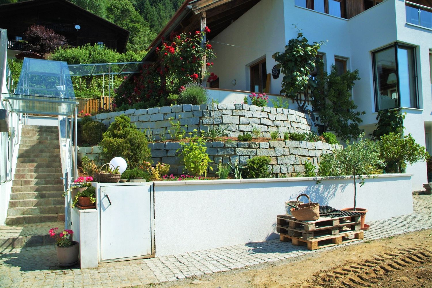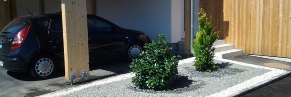 Errichtung eines Verbindungsweges zwischen Haus und Garage und dessen Gestaltung, Bepflanzung der neu errichteten Kleinbauwerke unter dem Nachhaltigkeitsaspekt der Wiederverwendung des vorhandenen Pflanzenmaterials.